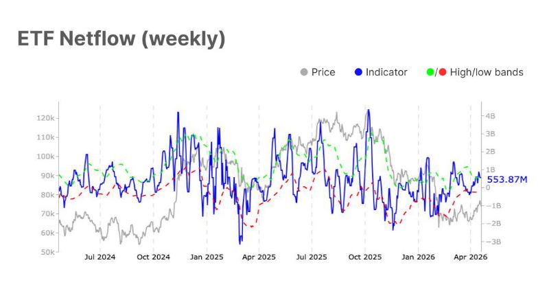 En contraste, los fondos cotizados en bolsa (ETF) de BTC en Estados Unidos continúan mostrando fortaleza. “El flujo neto semanal ha aumentado hasta 553,9 millones de dólares, frente a los 251,7 millones previos”, indica el informe.