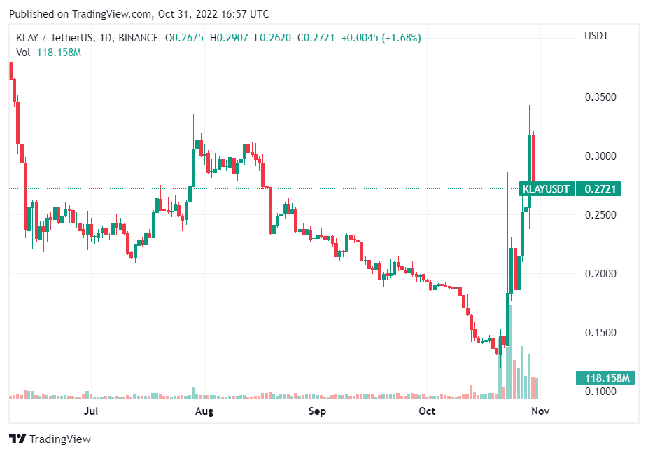 El precio de Klaytn (KLAY) pasó de USD 0,12 hasta USD 0,31 en nueve días.