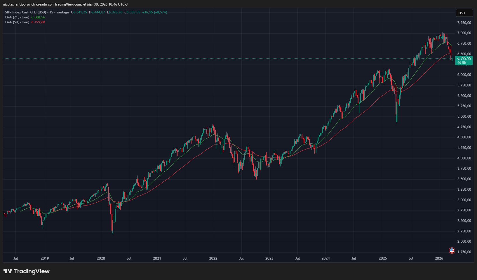 En el siguiente gráfico puede observarse, por ejemplo, que el índice S&P500 (representativo de la economía estadounidense) ha alcanzado máximos históricos este año, pero está mostrando cierta caída. Si esa corrección se convirtiera en una tendencia bajista sostentida, el impacto sobre bitcoin podría ser mayor.