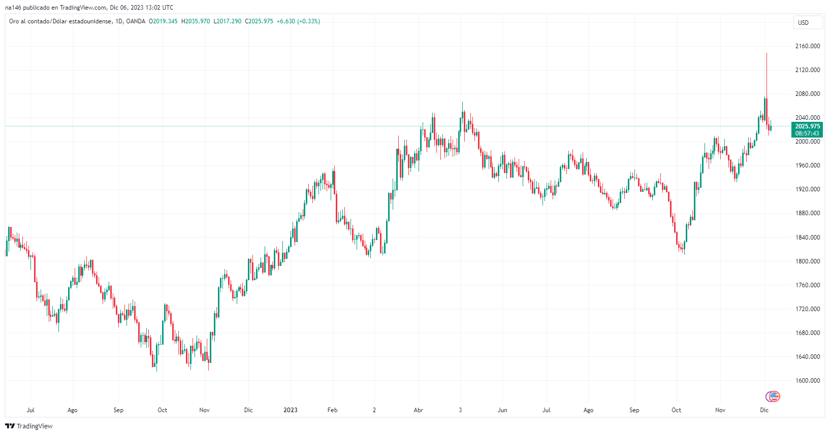Al momento de esta publicación, cada onza de oro se comercia por alrededor de 2.026 dólares estadounidenses como se aprecia en el siguiente gráfico: