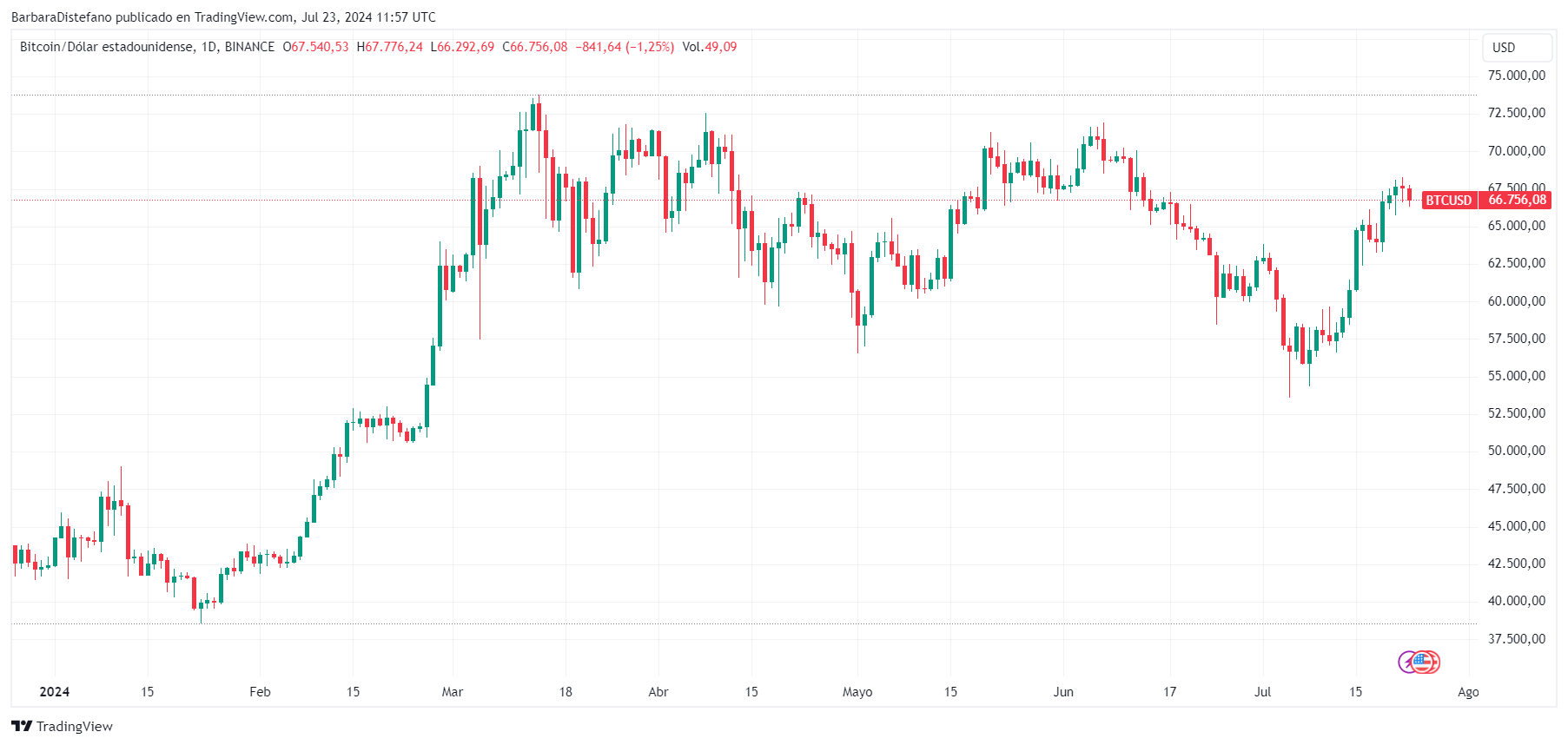 Por ejemplo, el precio de bitcoin percibió una ligera subida el 11 de enero cuando se lanzaron sus ETF en el mercado estadounidense y se sumergió luego en un retroceso que superó casi un mes después. Una vez pasado ese proceso, emprendió una carrera alcista que lo llevó hasta los USD 73.700, su nuevo récord de cotización, como se ve a continuación.