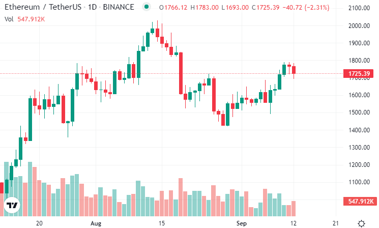 Ese mismo martes, el 6 de septiembre, la criptomoneda se encontró con un techo un poco por debajo de esa marca de 1.700 y, junto con bitcoin (BTC) y el resto del mercado, sufrió una repentina caída. En el caso de ETH, le llevó al nivel de los 1.500 dólares.