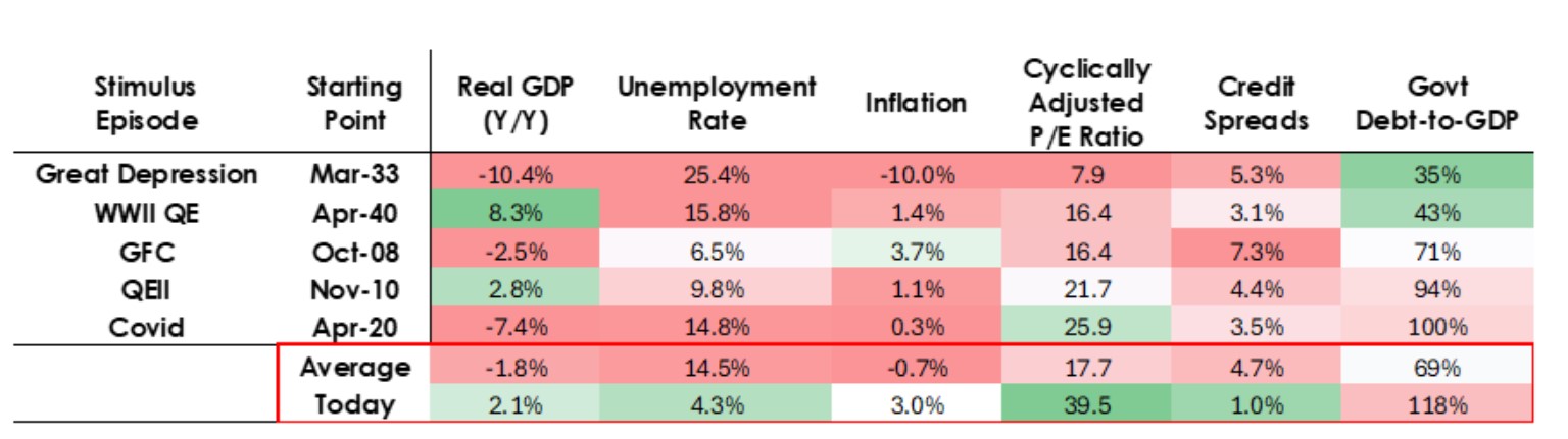 La siguiente tabla compartida por Dalio muestra una comparativa de distintos episodios histรณricos de estรญmulo monetario โla Gran Depresiรณn, la Segunda Guerra Mundial, la crisis financiera global de 2008, el primer programa de alivio cuantitativo (QE1) y la pandemia de COVID-19โ en contraste con las condiciones actuales de la economรญa estadounidense. Los indicadores incluyen crecimiento del PIB real, tasa de desempleo, inflaciรณn, relaciรณn precio-beneficio ajustada cรญclicamente (CAPE), diferenciales de crรฉdito y deuda pรบblica sobre el PIB.