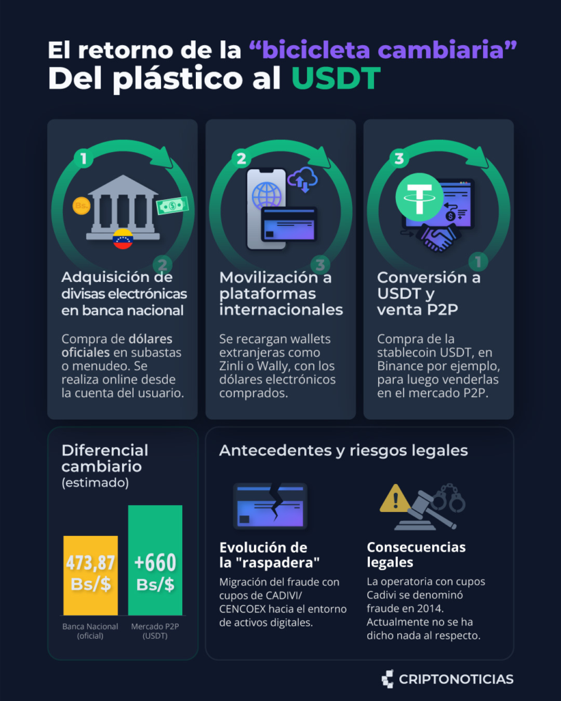 El proceso de la nueva «bicicleta cambiaria» se basa en un ciclo de arbitraje donde el usuario adquiere divisas (solo virtuales) en la banca nacional, a un promedio de 430 bolívares, y las transfiere a tarjetas de débito internacionales emitidas por los bancos locales. Luego usa dichas tarjetas para recargar wallets virtuales como la de Zinli o Wally, y con ellas compra USDT en Binance. Posteriormente, vende esos activos en mercados P2P a una tasa superior, que oscila los 570 bolívares por USDT, según datos de P2P.Army.
