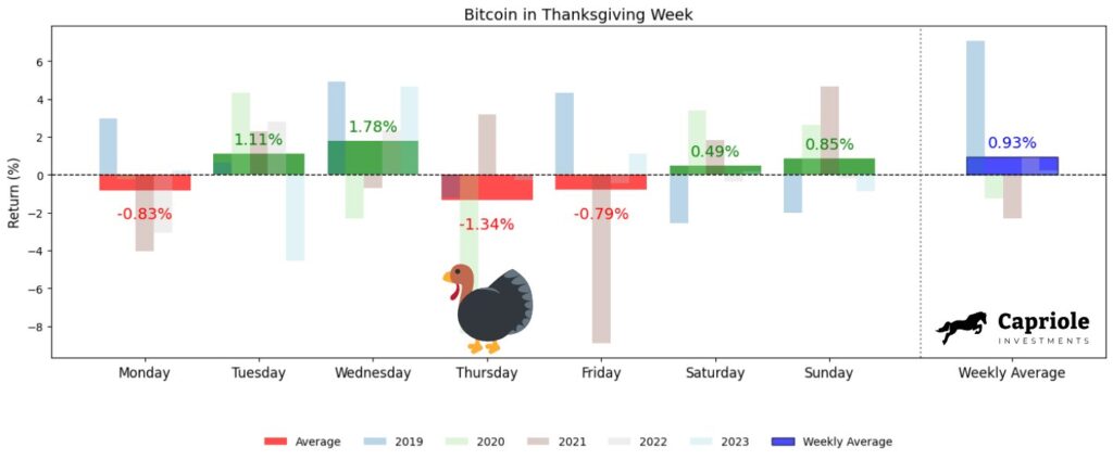 En su cuenta de X (antes Twitter), señaló que los miércoles antes del feriado suelen ser días alcistas para bitcoin, pero bromeó diciendo que «se mata al pavo» el jueves, haciendo referencia al festivo estadounidense, donde «bitcoin también muere un poco».