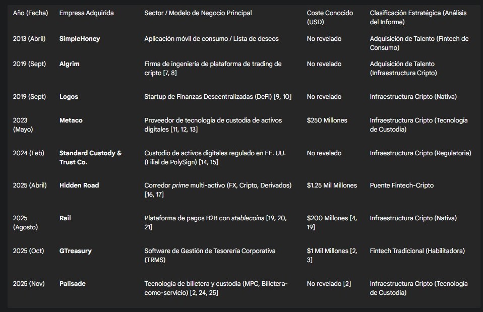 En 2025, la compañía incrementó las compras con la integración del bróker Hidden Road por 1.250 millones de dólares en abril, la plataforma de stablecoins Rail por 200 millones y la firma de sistemas de gestión de tesorería GTreasury por 1.000 millones en octubre, como lo reportó CriptoNoticias.