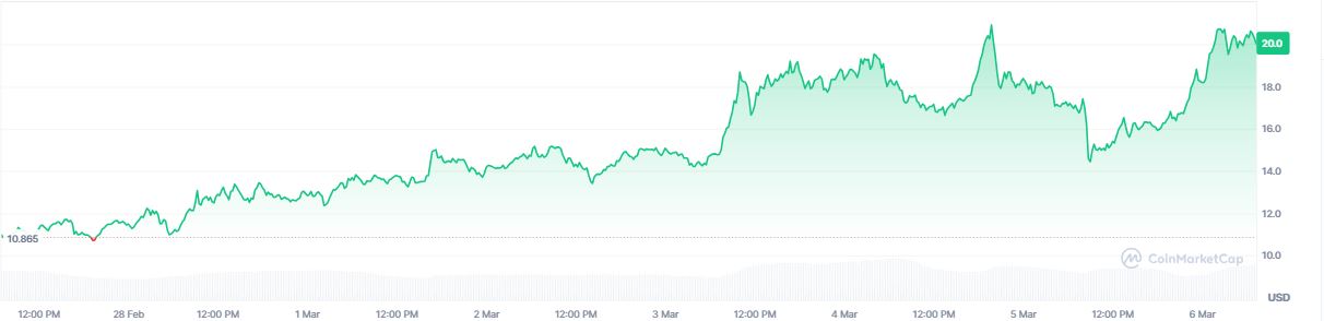 Su precio pasรณ de 10,99 a 20 dรณlares en los รบltimos siete dรญas, lo que representa un incremento del 82%, tal como se observa en el siguiente grรกfico: