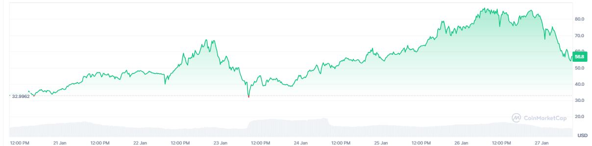 En ese período, vale remarcar que el token alcanzó un máximo histórico (ATH) de 87,79 dólares el 26 de enero, equivalente a una subida de aproximadamente 95% respecto al valor inicial de la semana.