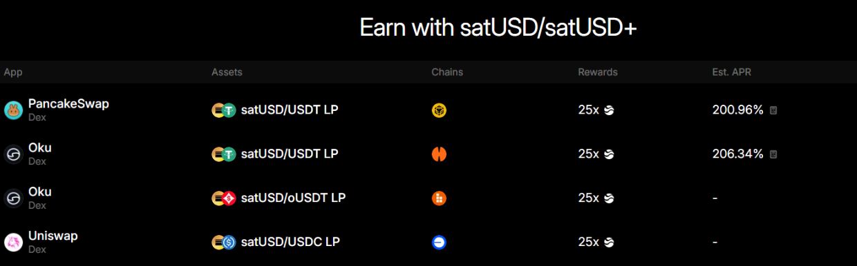Una vez emitido, satUSD puede utilizarse dentro del propio protocolo para generar rendimiento o desplegarse en aplicaciones externas compatibles. La plataforma muestra distintas opciones de uso, como staking de satUSD para obtener satUSD+, así como participación en pools de liquidez junto a otras stablecoins en diferentes aplicaciones, con estimaciones de rendimiento visibles desde la interfaz.