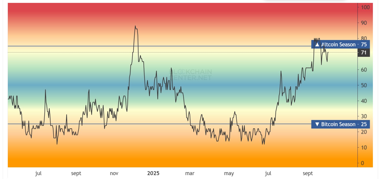 Los datos de mercado respaldan parte de este análisis. El Índice de Altseason, que mide la proporción de criptomonedas que superan el rendimiento de BTC en periodos de 90 días, indica que actualmente el 71% de las 50 principales monedas ha tenido un mejor desempeño, tal como se ve a continuación: