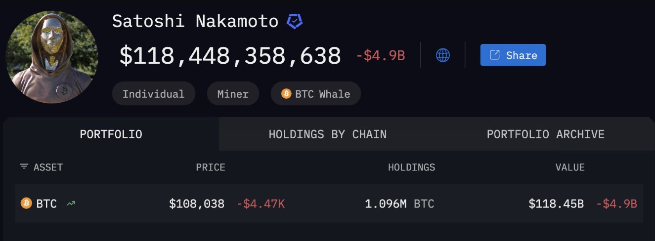El valor en dólares de los 1,09 millones de bitcoin (BTC) que se presume pertenecen a Satoshi Nakamoto, creador anónimo de la moneda digital, cayó en torno a USD 5.000 millones en las últimas 24 horas.