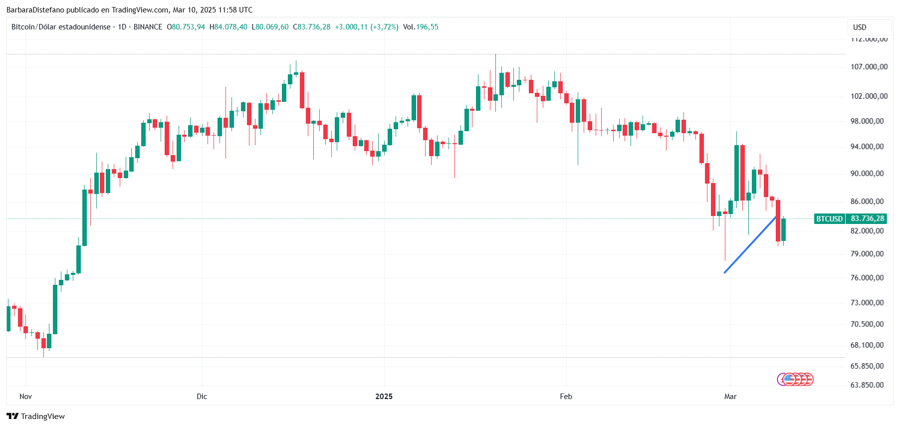 Con esta situaciรณn, el precio de BTC decayรณ ayer a los USD 80.000, perdiendo la tendencia de mรญnimos mรกs altos de las รบltimas dos semanas. Asรญ puede verse a continuaciรณn.