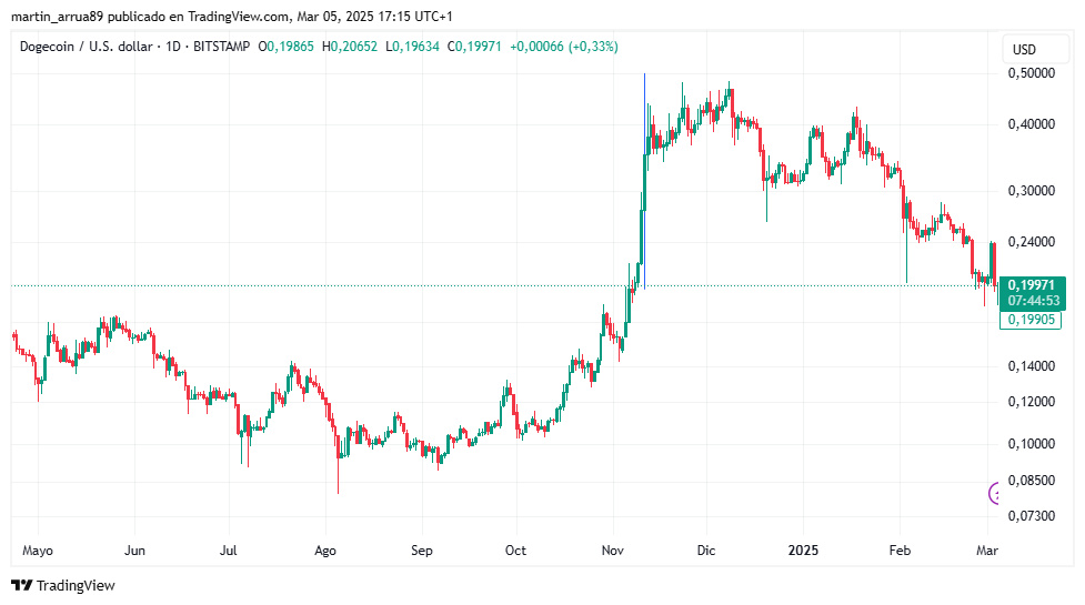 De esta tendencia bajista tampoco escapa dogecoin (DOGE), la memecoin más longeva y que funciona como una suerte de referencia en el mercado. Su precio era de 0,40 dólares antes de la asunción presidencial de Donald Trump, pero actualmente se encuentra en 0,20 dólares.