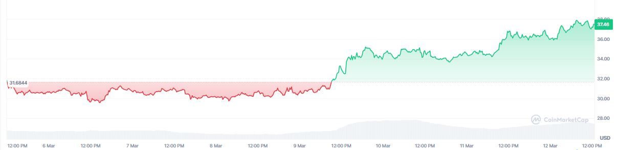 Del 6 al 12 de marzo, el precio del activo pasรณ de 31,20 a 37,44 dรณlares, lo que representa una subida del 20%. Pese a este repunte, el token todavรญa se mantiene 37,41% por debajo de su mรกximo histรณrico (ATH) de 59,39 dรณlares.