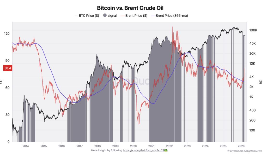 El gráfico elaborado por CryptoQuant muestra la relación histórica entre el precio del petróleo Brent y BTC.