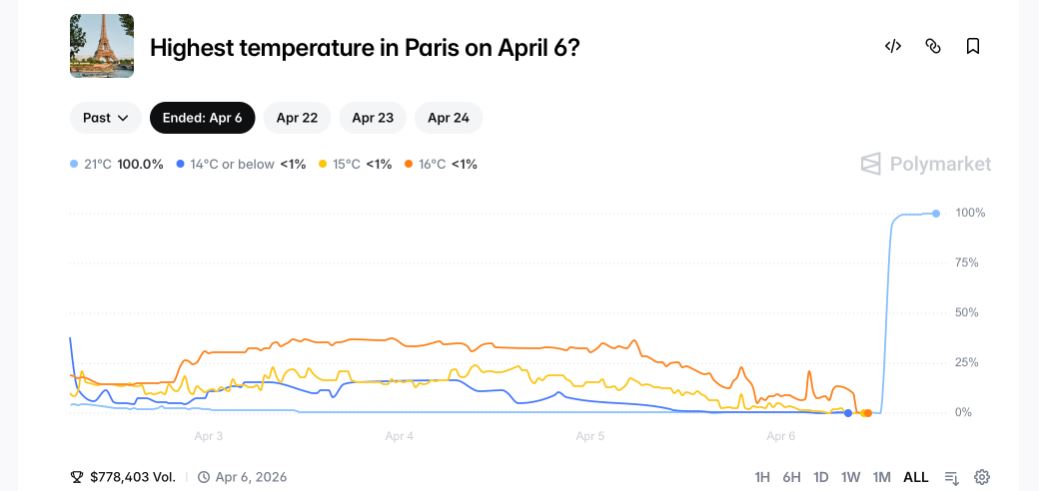 En respuesta, el 19 de abril, Polymarket modificó la fuente de datos para sus mercados climáticos en París, reemplazando la estación de Charles de Gaulle por la del aeropuerto de Paris-Le Bourget.