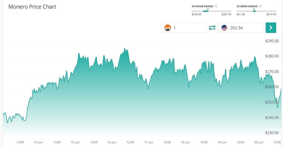 Entre tanto, el precio de monero ha estado en avance constante desde el 13 de junio, llegando a un máximo de USD 287,39 el 16 de junio. En promedió XMR ganó 8%.