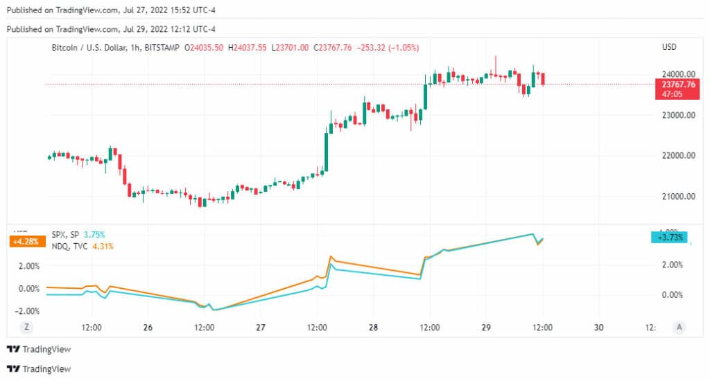 Al lado del casi 10% de repunte de bitcoin en la semana, Nasdaq muestra 4,28% de mejora y S&P 500 avanzó 3,73% en el mismo período.
