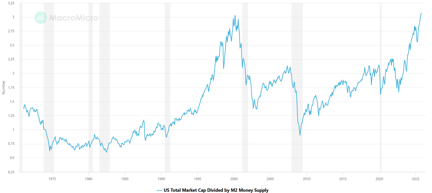 El mercado de valores en Estados Unidos puede que esté en niveles de sobrevaloración extrema y que las acciones estallen como la burbuja de las empresas «puntocom» en el año 2000. Así lo sugiere la capitalización total bursátil del país dividida por la oferta monetaria M2.