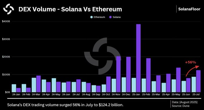 Volumen DEX en Solana alcanzó USD 124.000 millones en julio, 42% más que Ethereum.