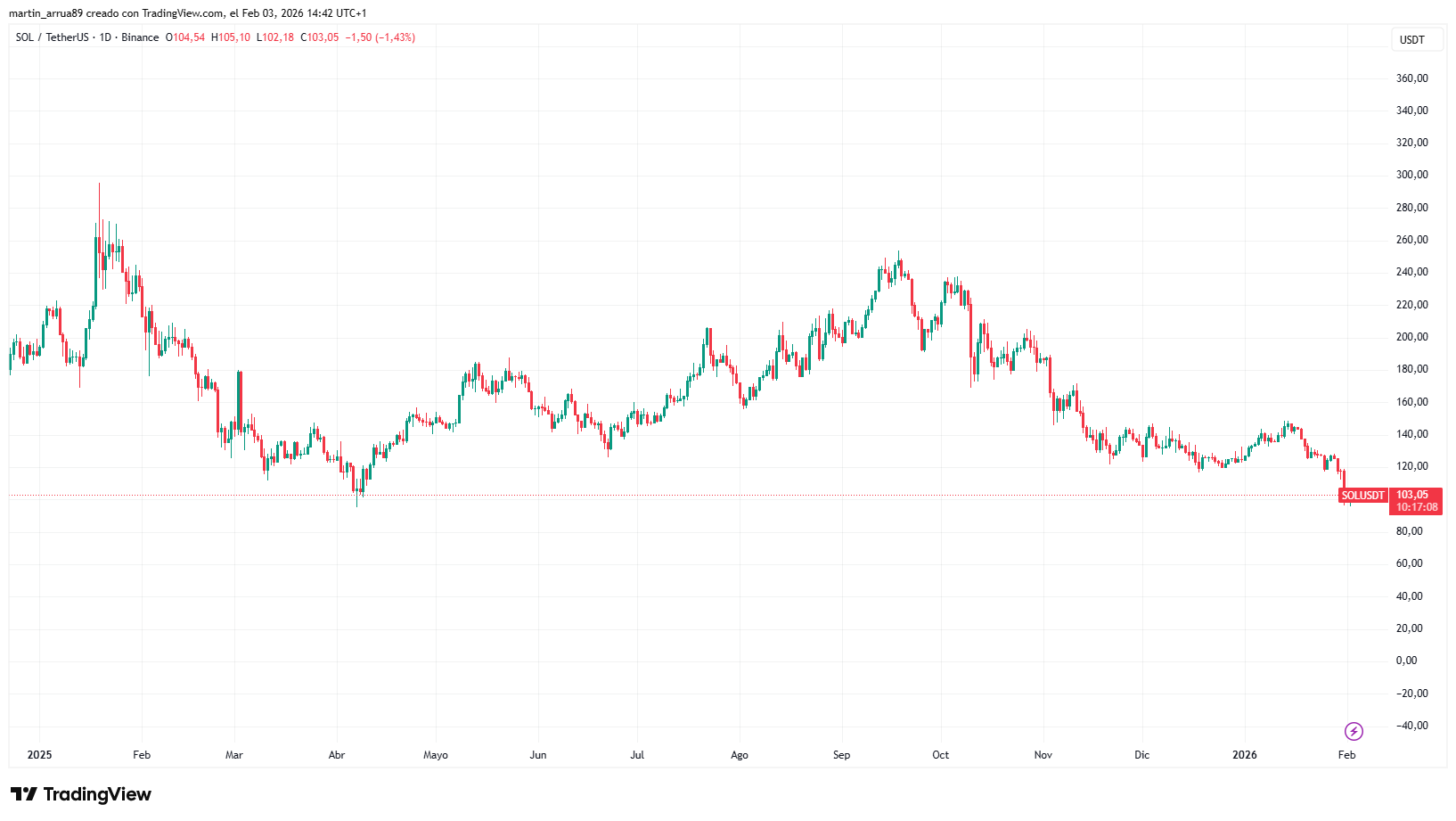 Al momento de publicación de esta nota, SOL cotiza en torno a 103 dólares, lo que representa una caída cercana del 65% respecto de su máximo histórico (ATH) de 294 dólares, alcanzado el 18 de enero de 2025, tal como lo reportó CriptoNoticias.