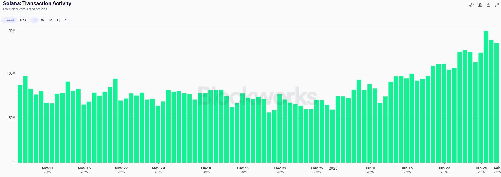 El 30 de enero fue el día de mayor actividad diaria jamás registrada en Solana, con 148 millones de transacciones no votantes procesadas en apenas 24 horas. Este dato marca un máximo histórico para la red y confirma un salto significativo en su nivel de uso.