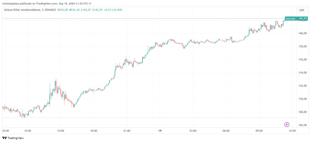 El precio del criptoactivo que pasó de los 127 dólares a 142 dólares en la jornada actual, marcando un repunte significativo, tal como se aprecia en el gráfico de TradingView.