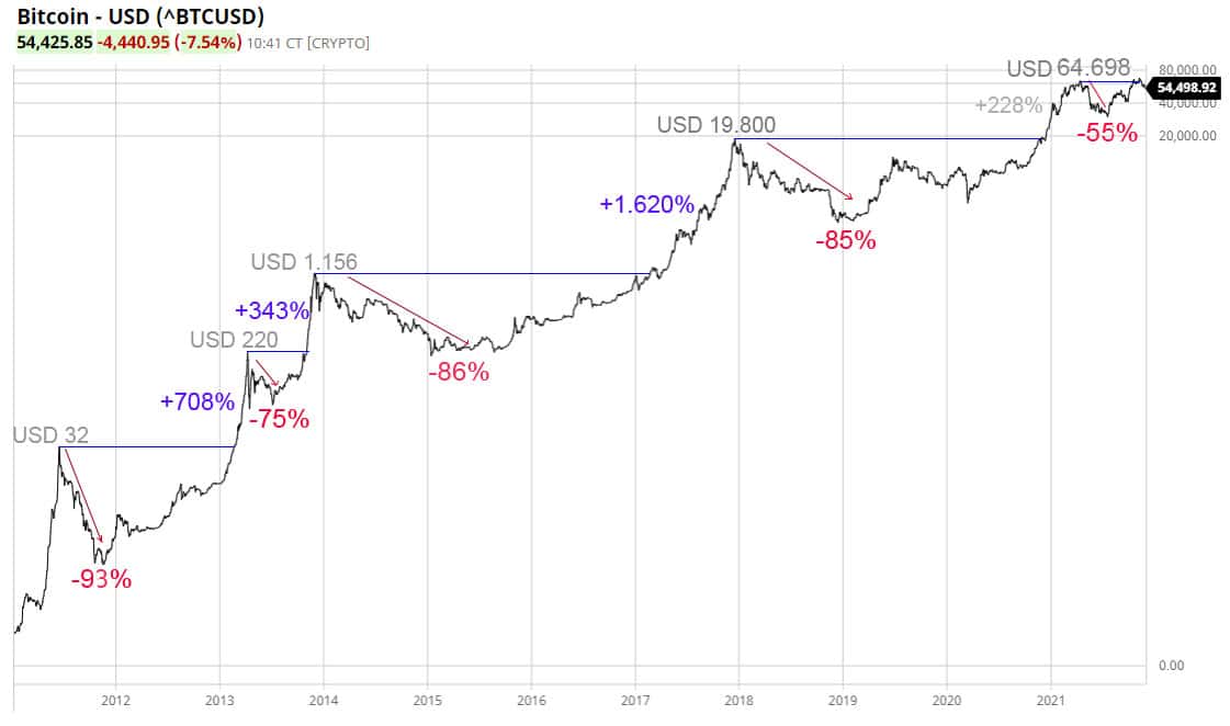 Después de una vuelta a los USD 20.000 que duró casi los tres años, en diciembre de 2020, se inició el repunte hacia el penúltimo máximo histórico de abril de 2021, cuya corrección ocurrió apenas en 3 meses y fue del 55%, bastante menor a las 3 anteriores.