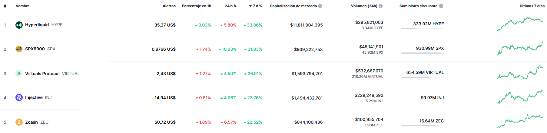 En los últimos 7 días, el precio del token SPX subió más de 30% y, en las últimas 24 horas la subida fue del 10%. Esto coloca a SPX como el segundo criptoactivo (dentro del top 100 por capitalización de mercado) con mayor subida semanal, tal como se ve en la imagen a continuación:
