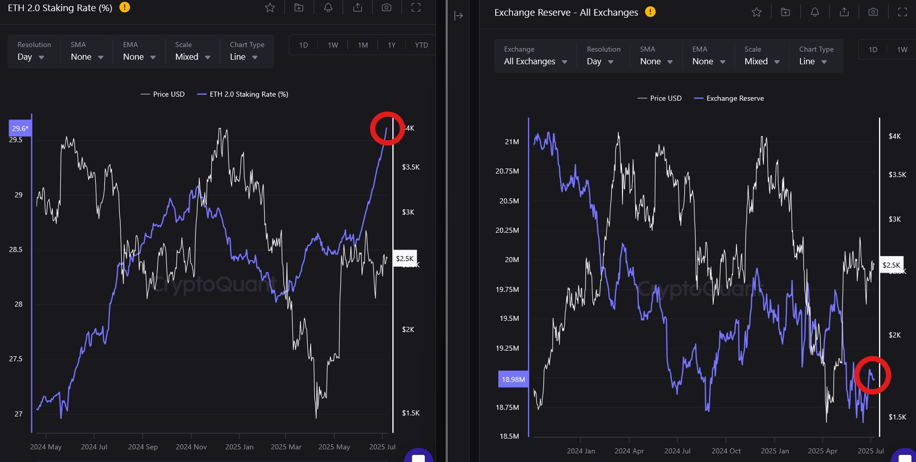 El círculo rojo en la gráfica de staking resalta un período de aumento significativo en la tasa de staking, que coincide con un incremento relativo en el precio de ETH. La gráfica de la derecha («Exchange Reserve – All Exchanges«), por otra parte, ilustra la cantidad total de ETH mantenida en las wallets de los exchanges.