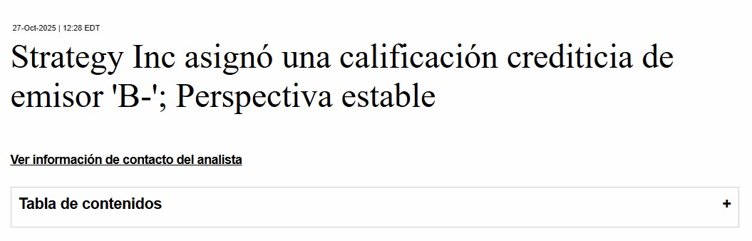 La compañía S&P Global Ratings otorgó la primera calificación crediticia a Strategy Inc., antes conocida como MicroStrategy. La agencia calificó a la empresa con un ‘B-’ y perspectiva estable, convirtiéndola en la primera firma con una tesorería basada principalmente en bitcoin (BTC) en recibir una evaluación de este tipo.