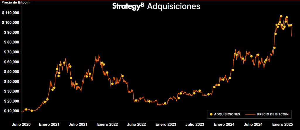 La caída de bitcoin (BTC) esta semana a precios que no tocaba en más de tres meses hace que la atención se pose sobre la empresa Strategy (ex MicroStrategy). Se trata de la empresa cotizada en bolsa que posee más BTC en el mundo y que tiene una estrategia de endeudamiento para realizar compras de este activo.