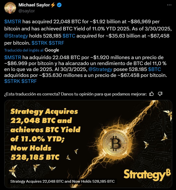 Según los datos compartidos por Saylor, al 30 de marzo de 2025 Strategy posee un total de 528.185 BTC, adquiridos por aproximadamente USD 35.630 millones. Esto se traduce en un precio promedio de USD 67.458 por bitcoin.