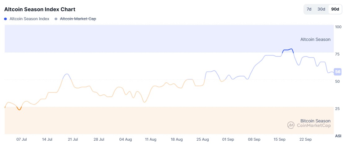 La consecuencia inmediata de este movimiento es el alejamiento de una altseason. El รญndice que mide la altseason se encuentra en 56, por debajo del umbral de 75 necesario para declararla.