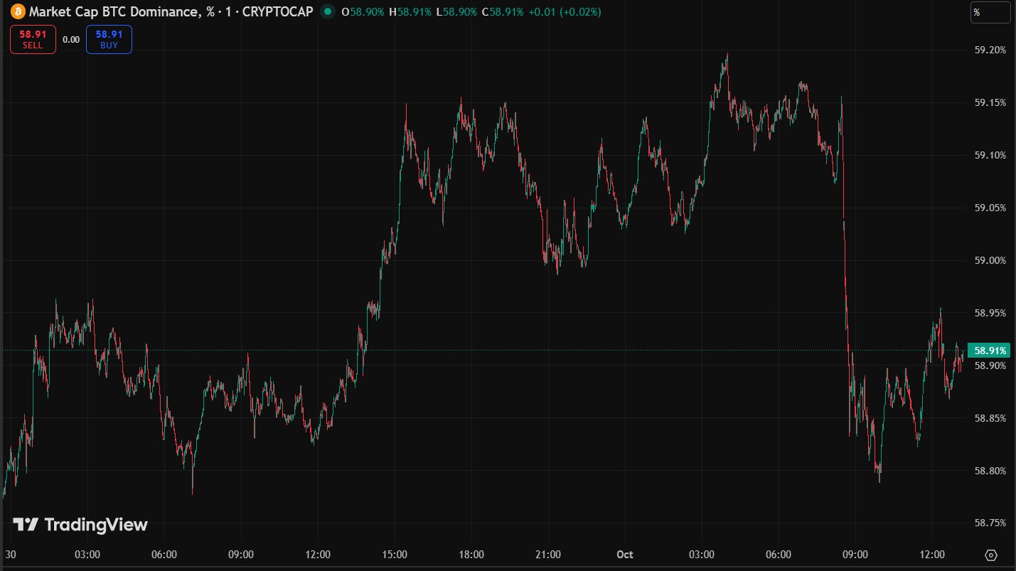 Actualmente, la mรฉtrica se ubica en 58,8%, lo que refuerza la tendencia de protagonismo de BTC frente al resto del mercado. Aunque, vale aclarar, la dominancia se desplomรณ desde un 59,1% este mismo miรฉrcoles 1 de octubre, tal como se ve en la siguiente grรกfica: