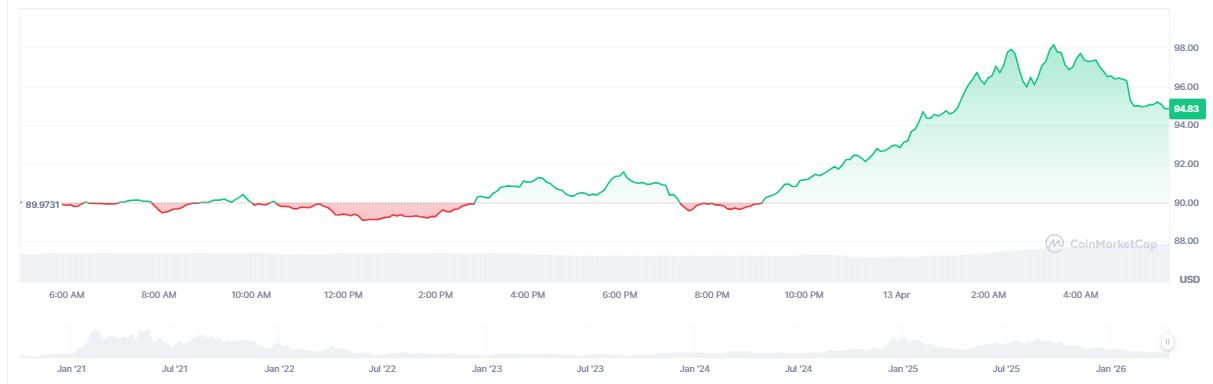 Al momento de la publicación de este artículo, 13 de abril de 2026, el token se negocia en 94,83 dólares y ha llegado hasta los 98 dólares esta madrugada: