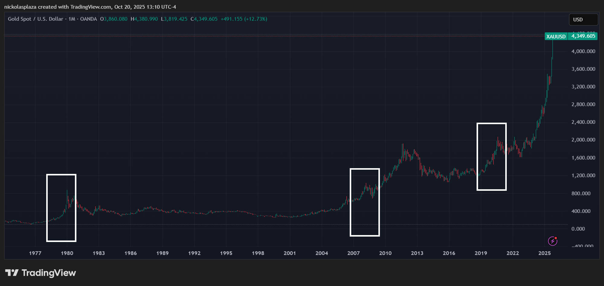 Histรณricamente, el oro ha seรฑalado momentos crรญticos con su aumento. En el aรฑo 1979 anticipรณ una inflaciรณn descontrolada y la pรฉrdida de confianza en el dรณlar. Para 2008 precediรณ la expansiรณn masiva de los balances de los bancos centrales tras el colapso crediticio. Luego, en 2020, marcรณ la intervenciรณn de la Reserva Federal de Estados Unidos (FED) para frenar una crisis de liquidez, como se aprecia en el siguiente grรกfico.