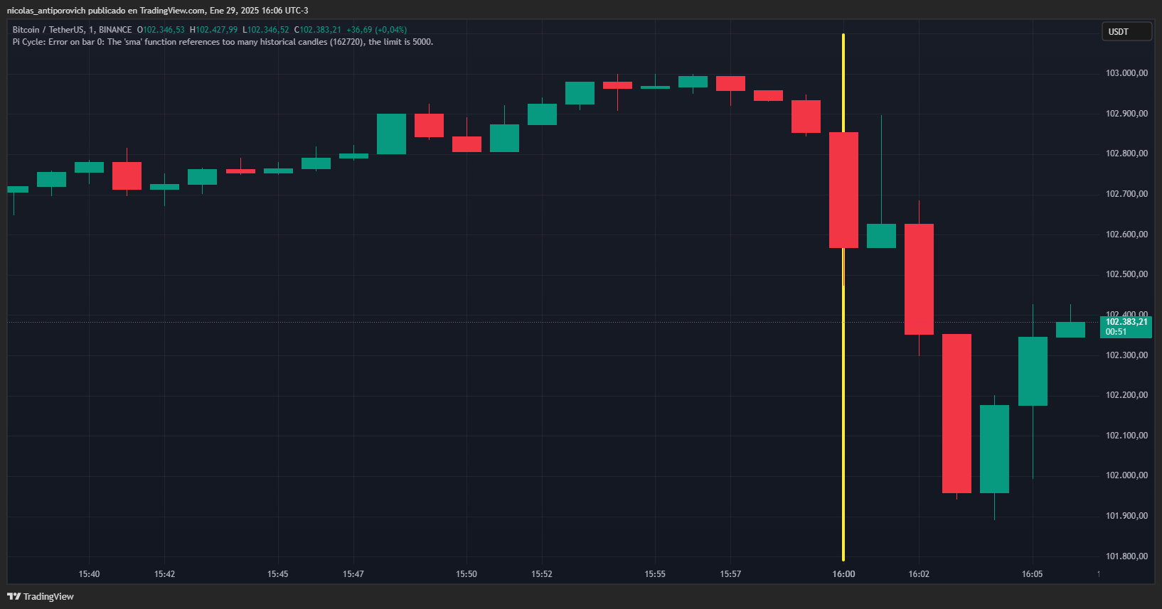 Si bien —tal como CriptoNoticias reportó esta mañana— esto era lo que el mercado esperaba, los primeros movimientos de bitcoin (BTC) fueron a la baja, como se observa en el siguiente gráfico: