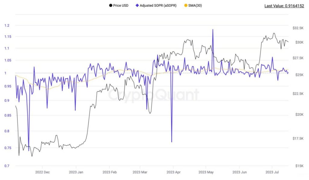 Además, la aSOPR (relación de beneficio de salida gastada ajustada) también emana augurios positivos. Esta métrica muestra la rentabilidad de las monedas vendidas durante un periodo específico y, si se observa que aquellas que se almacenaron por más de una hora durante 30 días, se vendieron principalmente en ganancias.