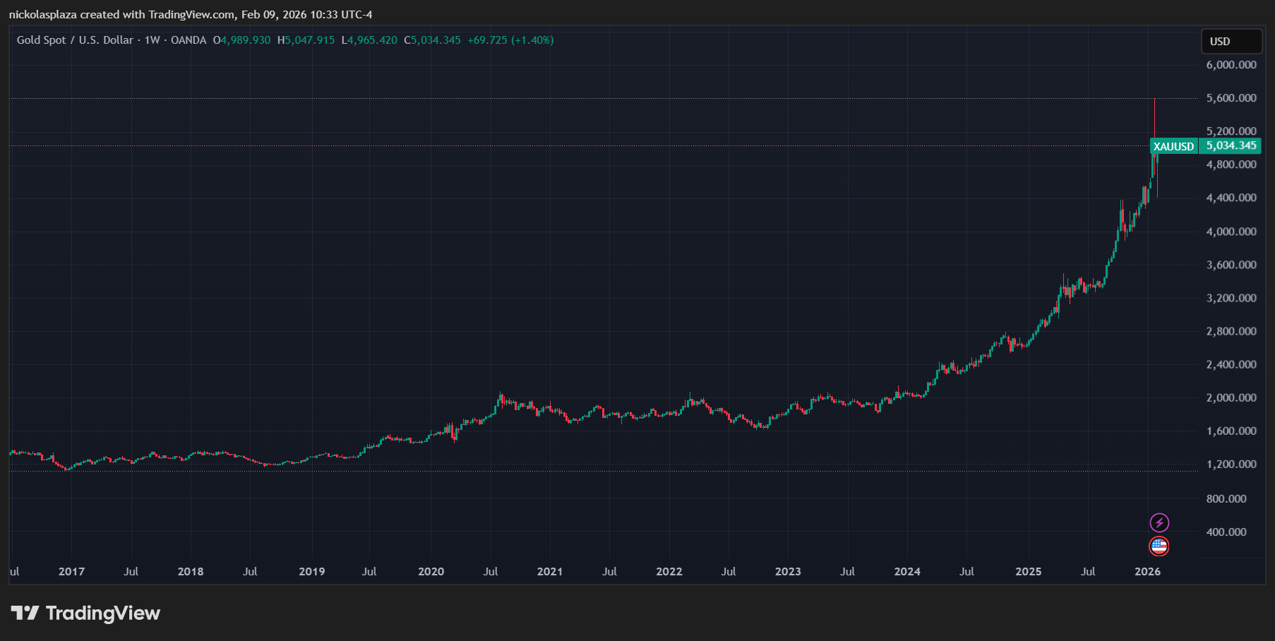 Esta visión se enmarca en un periodo de fuerte revalorización del oro, que alcanzó un máximo histórico por encima de los 5.500 dólares por onza a finales enero de 2026, impulsado por la búsqueda de refugios seguros ante la incertidumbre macroeconómica y la diversificación lejos del dólar estadounidense. Aunque el precio experimentó correcciones posteriores, se mantiene en los 5.000 dólares por onza en febrero de 2026, como se aprecia en el gráfico.