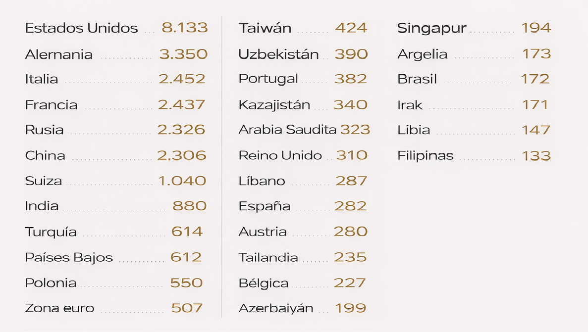Estas adquisiciones han permitido a Tether superar las reservas oficiales de oro de países como Australia, Emiratos Árabes Unidos, Catar, Corea del Sur y Grecia, colocándola entre los 30 mayores poseedores mundiales de lingotes.