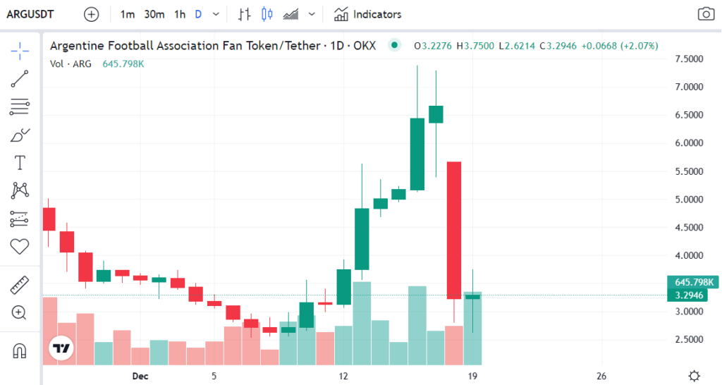 En cuanto al caso especรญfico de ARG, es destacable que la caรญda sufrida en las รบltimas horas (a pesar de alzar la Copa) ha sido superior en tรฉrminos porcentuales a la depreciaciรณn que atravesรณ el token luego de perder en su debut contra Arabia Saudรญ. En esa ocasiรณn, el fan token emitido por Socios.com con respaldo de la Asociaciรณn del Fรบtbol Argentino, la AFA, cayรณ alrededor de 30%.