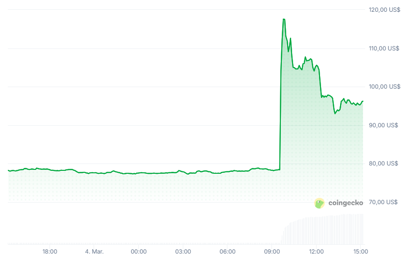 Como consecuencia de este anuncio, el precio de OKB, token de utilidad del exchange OKX, tuvo una subida casi vertical en las últimas 24 horas, llegando a ser del 40% en su punto más alto tal como se ve en la imagen a continuación: