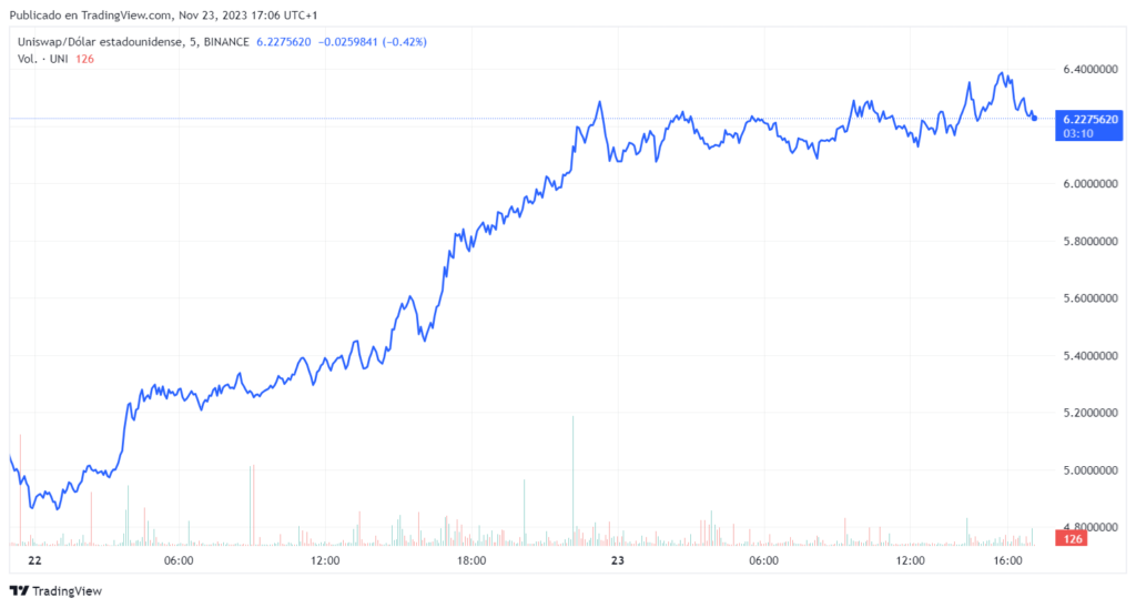 La nueva propuesta (que le otorga mayor poder a UNI y, por lo tanto, lo hace más valioso) ha influenciado en el desempeño del token. En las últimas 24 horas tuvo una subida cercana a 20%. El precio del activo digital pasó de USD 4,85 a USD 6,22, como se puede apreciar en el gráfico de TradingView.