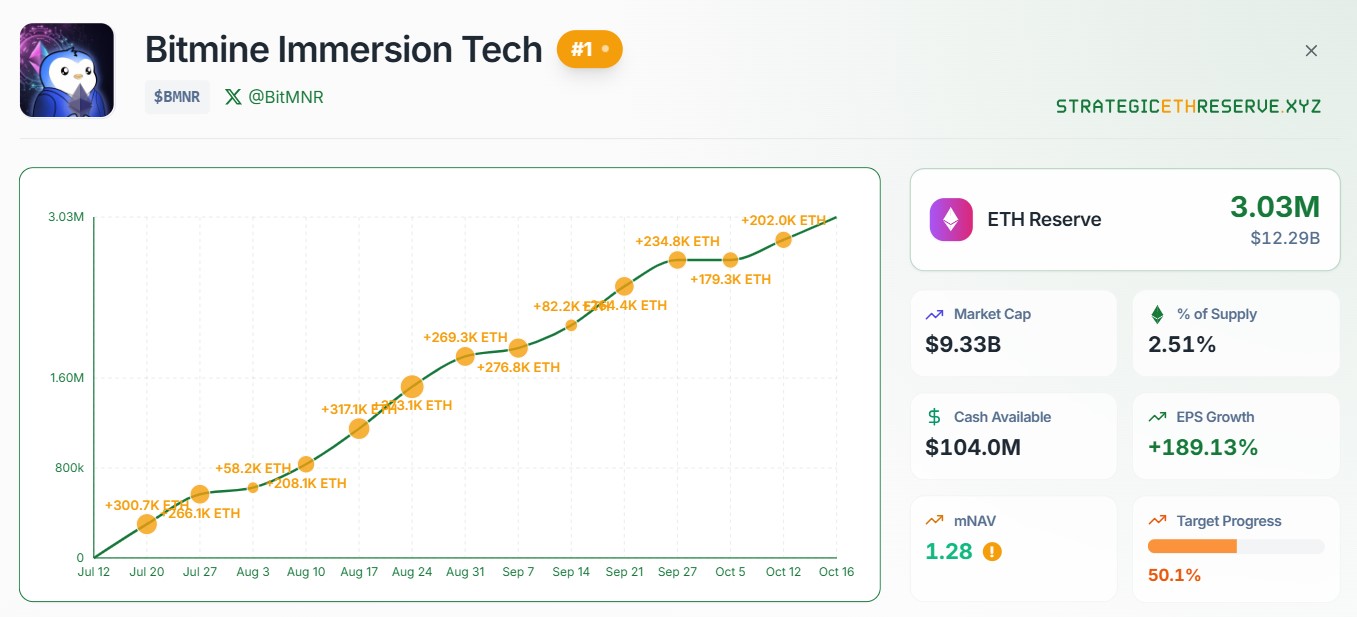Bitmine Immersion Tech incrementó su reserva de ether (ETH) durante la reciente corrección del mercado y superó los 3 millones de unidades en su tesorería, equivalentes a 12.289 millones de dólares.