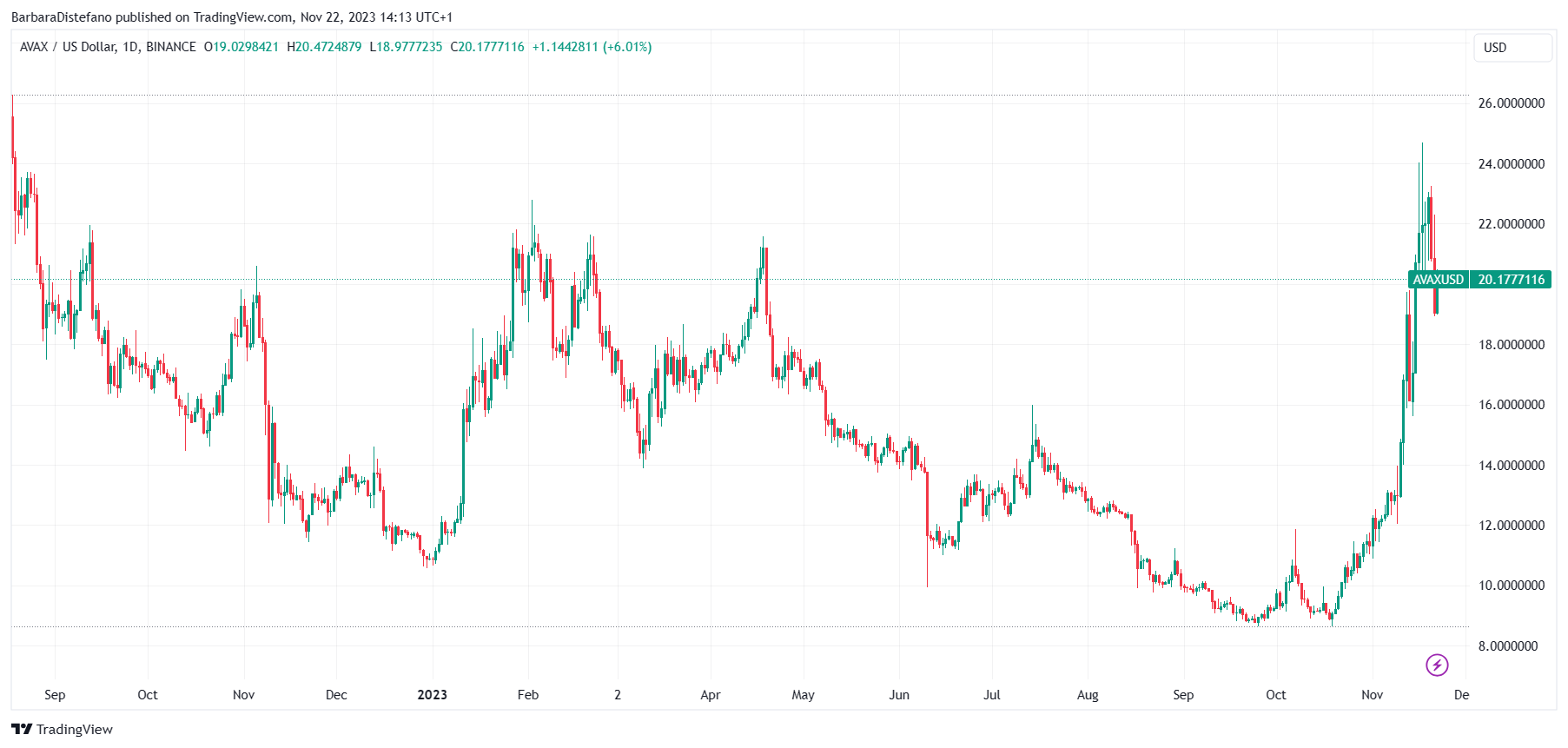 Como exhibe el siguiente gráfico de TradingView, esta subida permitió que AVAX alcanzara su precio más alto en diez meses, desde agosto de 2022. Después de ello, retrocedió ligeramente hasta los USD 20, la zona de máximos que ha tenido en 2023.