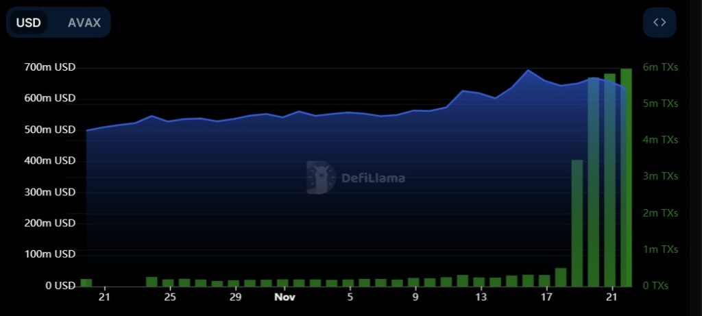 Las transacciones diarias en la red Avalanche aumentaron 3.000% en tan solo un mes, pasando de alrededor de 200.000 a 6 millones. Así lo exhiben los datos en cadena del explorador DefiLlama actualizados al 21 de noviembre.