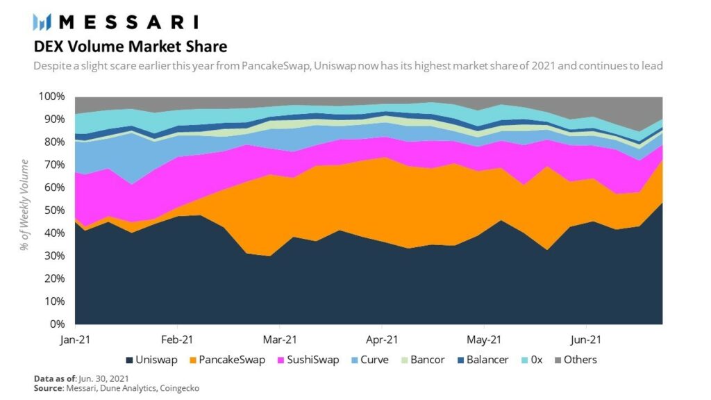 El mercado de los exchanges DeFi ha crecido no solo en volúmenes en meses recientes. También nuevas plataformas se han ido sumando al juego. Y aunque Uniswap fue perdiendo protagonismo frente a alternativas como PancakeSwap, hacia finales del trimestre volvieron a dominar alrededor de 54% del volumen total de comercio de las DEX.