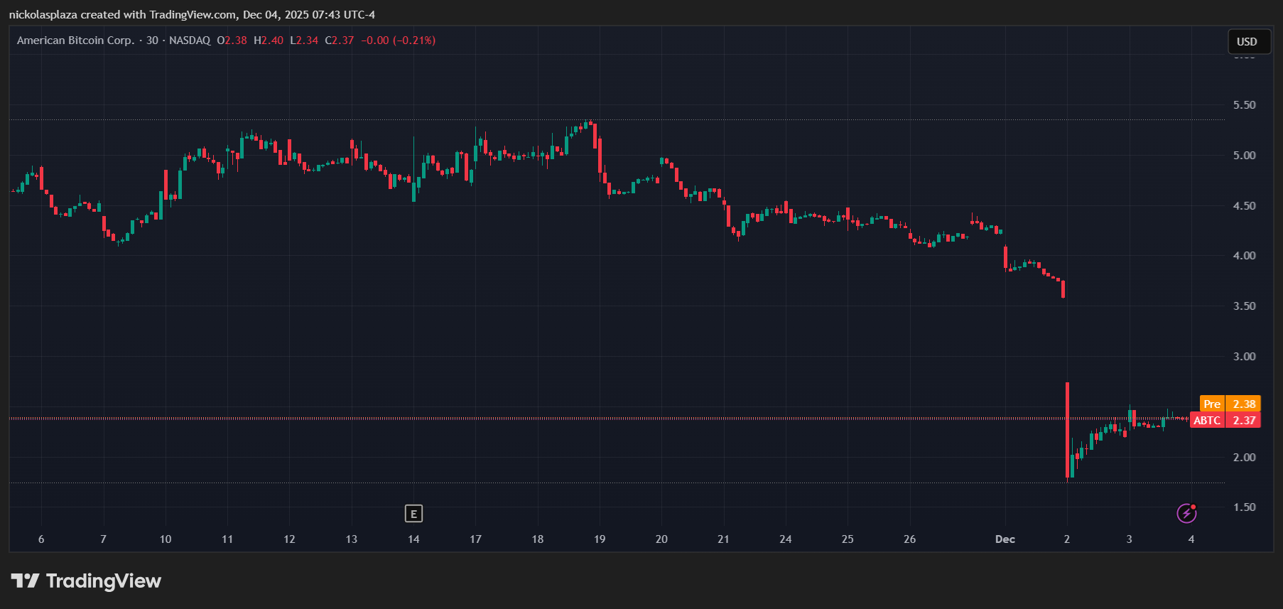 El precio de las acciones de American Bitcoin Corp se precipitó desde 4,88 dólares a comienzos de noviembre hasta tocar un mínimo de 1,72 dólares, logrando recuperarse posteriormente hasta situarse en 2,37 dólares por unidad en la actualidad, como se aprecia en el siguiente gráfico.