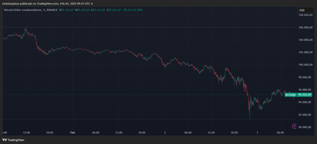 Entre el pasado viernes y ayer domingo, bitcoin pasó de los 105.000 dólares del viernes a tocar un mínimo de 92.000 dólares el domingo. En las horas siguientes, la moneda mostró signos de recuperación, retornando a los 105.000 dólares, como se aprecia en el siguiente gráfico de TradigView.